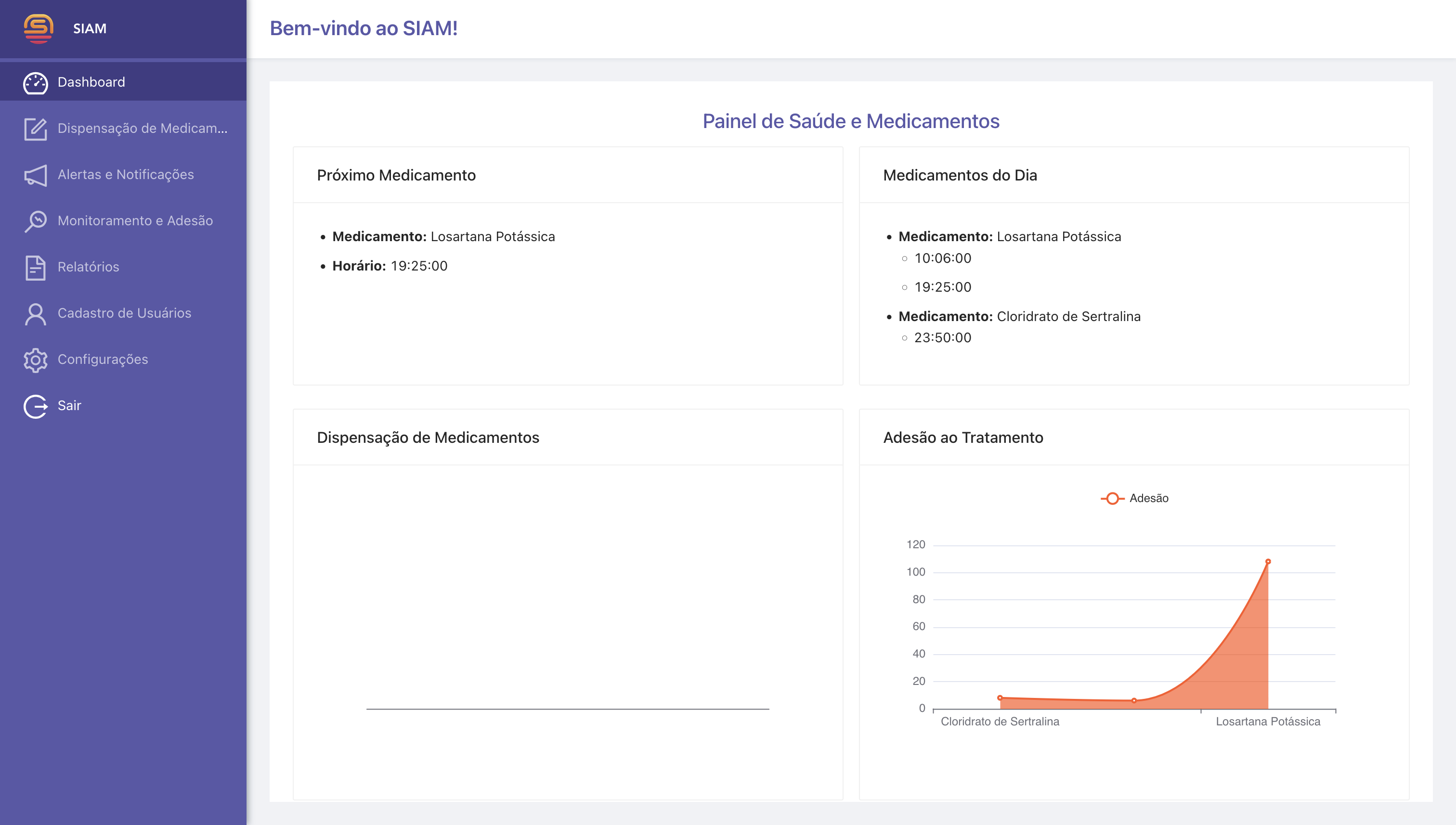 O SIAM (Sistema Inteligente de Administração de Medicamentos) é um projeto voltado para a automação e monitoramento da dispensação de medicamentos. O objetivo principal é facilitar a administração correta dos medicamentos em horários específicos, proporcionando maior segurança e precisão.